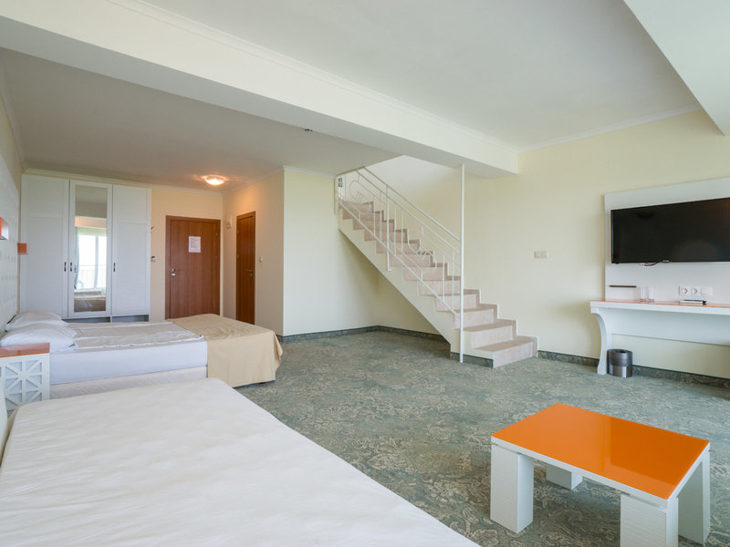 - Rodinná izba Mezonet (FZM2), rodinná izba, nefajčiarska izba, morská strana, výhľad na more, výhľad do záhrady, cca 40 m², posledná kompletná rekonštrukcia v roku 2017, posledná čiastočná rekonštrukcia v roku 2017, celkový počet izieb v tomto type izby. : 2, rozloženie: mezonet, 2 spálne, 2 samostatné postele (90x200cm), 1 posteľ king (180x200cm), detská postieľka: bez poplatku, klimatizácia: bez poplatku, individuálne nastaviteľné, kúrenie: individuálne nastaviteľné, podlaha: koberec , písací stôl, minibar: za poplatok, telefón, Internet: WLAN/WiFi : bez poplatku, televízor: plochá obrazovka, v obývacej časti, v spálni, nemecký program, Deutsche Welle, satelitná TV, upratovanie: bez poplatku, sprcha , samostatná sprcha, WC, samostatné WC, fén, balkón: s posedením