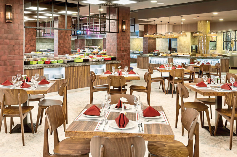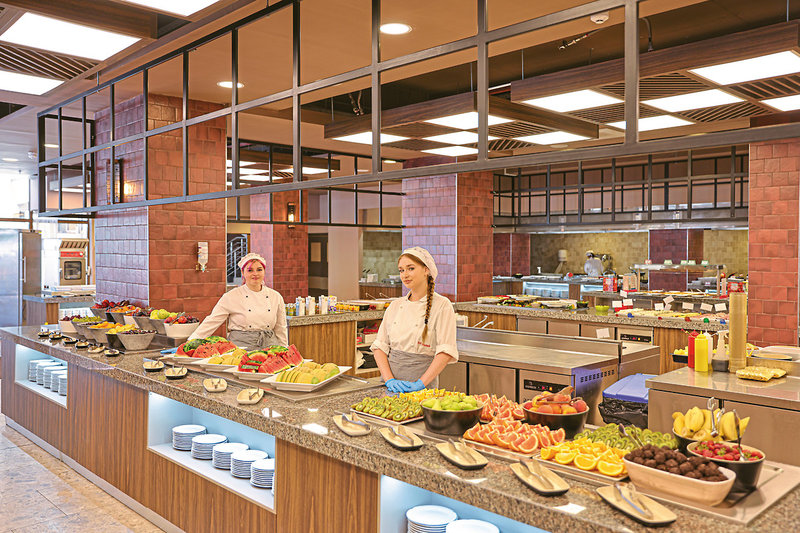 - All Inclusive: Frühstück (Buffet), Mittagessen (Buffet), Abendessen (Buffet), 2x pro Woche Themenabende, Getränke kostenfrei (Softdrinks, Mineralwasser, Kaffee/Tee, Bier, Hauswein, Cocktails, lokale Spirituosen, 10-23 Uhr), Snacks (22-23 Uhr), Eis (11-16 Uhr), Gelateria (Juni-September, 10-12.30, 13.30-16.30 Uhr), Abendessen in den Themenrestaurants kostenfrei (Reservierung erforderlich), Fisch & Chips, Paninis, Burger Bar (12-15 Uhr), italienisch und chinesisch (18.30-21.30 Uhr), Japanese Corner (21-22 Uhr), Taperia und Biergarten: Snacks (10-12.30, 15-17 Uhr), Tapas (20-22 Uhr), Biergarten: deutsche Küche (11-17 Uhr), Paellas (12-16 Uhr), Kuchen/Obst an der Lobby (15-18 Uhr), Donuts (10-12 Uhr), Pizza, Fritten (12.30-16 Uhr), Snacks und Obst an verschiedenen Bars im Resort (10-12.30, 15-17 Uhr), All American Diner (Frühstück/Mittag/Abendessen): Pankaces, Buffalowings, Ribs, Burger
