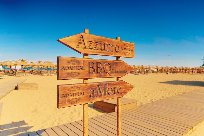 - Sandstrand: leicht abfallend, öffentlich, von der Anlage getrennt durch Promenade, Sonnenschirme, Liegen, Strandtuch/Badetuch