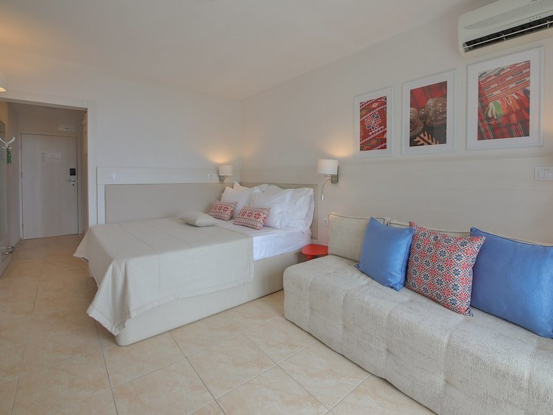 So wohnen Sie: Für angenehmes Raumklima in den Zimmern sorgen eine Klimaanlage und eine Heizung. Die Gäste können den Meerblick von Balkon oder Terrasse genießen. Die Zimmer verfügen über ein Doppelbett und ein Sofabett. Kinderbetten für die jüngsten Gäste sind ebenso vorhanden. Außerdem sind ein Safe, eine Minibar und ein Schreibtisch verfügbar. Verschiedene Kommunikations- und Unterhaltungsmöglichkeiten werden durch die komfortable Ausstattung mit einem Telefon, einem TV-Gerät mit Satelliten-/Kabelempfang, einem Radio und WiFi (ohne Gebühr) gewährleistet. Im Badezimmer, ausgestattet mit einer Dusche und einer Badewanne, gibt es einen Haartrockner. Als Besonderheit genießen die Gäste in den Badezimmern Kosmetikartikel und eine Auswahl an Handtüchern. Die Unterbringung bietet Familien- und Nichtraucherzimmer.