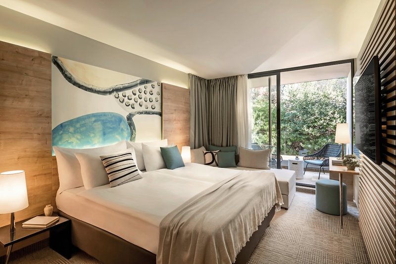 - 21-25 qm, Dreibett, Bettwäsche, Handtücher und Matratzen aus 100% Bio-Baumwolle, Dusche oder Badewanne, Haartrockner, Klimaanlage, Minibar kostenpflichtig, Safe, TV (Sat-TV), Balkon