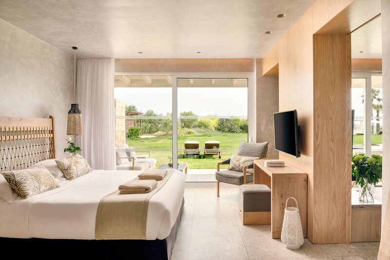 Das Edel-Hotel zelebriert mediterrane Schönheit: Am Strand erwarten Sie bequeme Holzliegen, von denen aus Sie den Blick auf das Mittelmeer genießen können. Der Pool ist elegant geschwungen und umgeben von Palmen und Pinien – ein Ort zum Abschalten und Genießen!