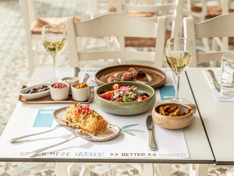 - Spezialitätenrestaurant „Meze by Elliniko“: Küche: griechisch, gesetztes Menü, klimatisierbar, Kinderhochstuhl, angemessene Kleidung erwünscht