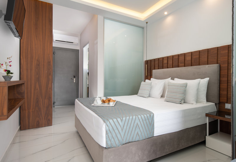 Die modern eingerichteten Zimmer mit Wohnraum Mit King-Size-Bett oder Doppelbett, 2 Extrabetten (Schlafsofa), Babybett (kostenlos), Heizung (individuell regulierbar), Wasserkocher (kostenlos), Balkon, Internet (kostenlos), Safe (kostenlos), Kapsel‑Kaffeemaschine (kostenlos) und Flatscreen-Sat-TV sowie individuell regulierbarer Klimaanlage. Badezimmer mit Dusche (Größe: 32 m²). Handtücher werden 3x pro Woche gewechselt.