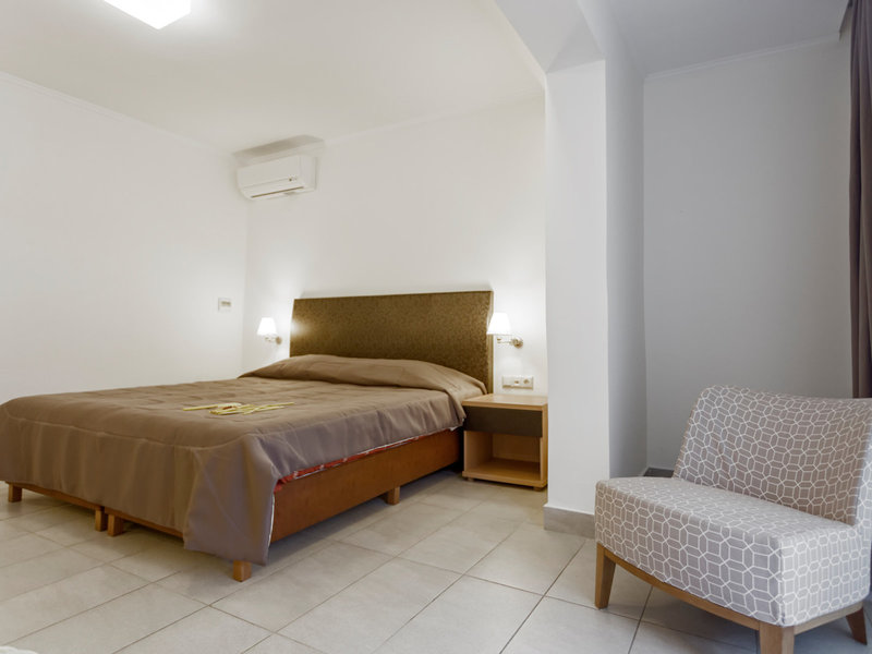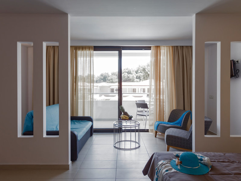 - Juniorsuite Gartenblick (JSG1), Juniorsuite, im Hauptgebäude, Neubau, eingeschränkter Meerblick, Gartenblick, ca. 28 - 30 m², letzte Komplettrenovierung 2016, Gesamtanzahl der Räume in diesem Zimmertyp: 1, Aufteilung wie folgt: kombiniertes Wohn-/Schlafzimmer, 1 Doppelbett (180x200cm), 1 Schlafsofa (170x190cm), Babybett: ohne Gebühr, Moskitonetz, Klimaanlage: ohne Gebühr, individuell regelbar, kalt, warm, Heizung: Mai und Oktober, Fußboden: Fliesenboden, Safe: ohne Gebühr, Sofa, Kühlschrank: ohne Gebühr, Wasserkocher, Telefon, Internet: WLAN/WiFi: ohne Gebühr, Fernseher: Flatscreen, im Schlafzimmer, deutsches Programm, Sat-TV, Badewanne oder Dusche, Dusche, WC, Bademantel: ohne Gebühr, Slipper: ohne Gebühr, Föhn, Kosmetikspiegel, Balkon oder Terrasse: mit Sitzgelegenheit