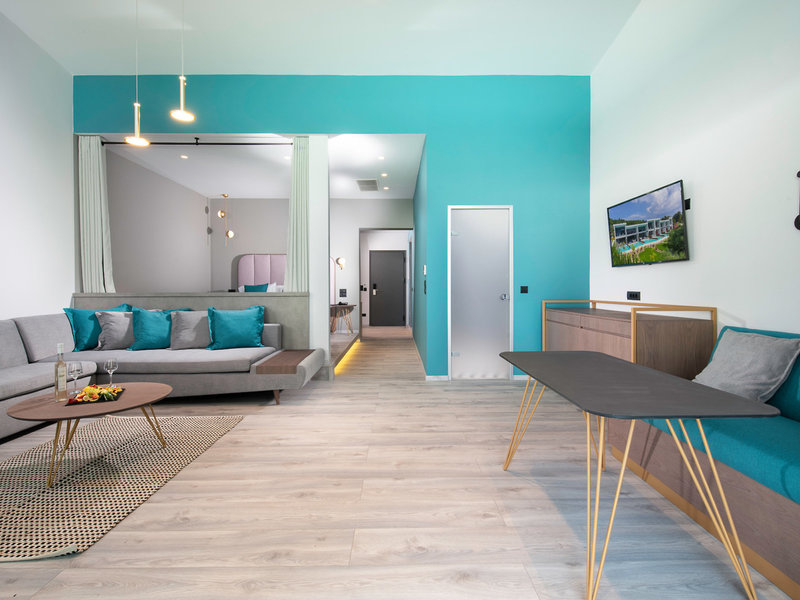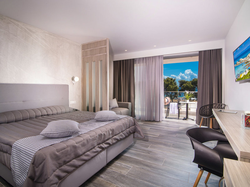 - Suita Junior s výhľadom do záhrady (JSG1), suita Junior, v hlavnej budove, nová budova, obmedzený výhľad na more, výhľad do záhrady, cca 28 - 30 m², posledná kompletná rekonštrukcia v roku 2016, celkový počet izieb v tomto type izby: 1, rozloženie: kombinovaná obývačka/spálňa, 1 manželská posteľ (180x200cm), 1 rozkladacia pohovka (170x190cm), detská postieľka: bez poplatku, moskytiéra, klimatizácia: bez poplatku, individuálne nastaviteľná, studená, teplá, kúrenie: máj a október, podlaha: dlažba, trezor: bez poplatku, sedačka, chladnička: bez poplatku , rýchlovarná kanvica, telefón, Internet: WLAN/WiFi: zadarmo, TV: plochá obrazovka, v spálni, nemecký program, satelitná TV, vaňa resp. sprcha, sprcha, WC, župan: zadarmo, papuče: zadarmo, fén, kozmetické zrkadlo, Balkón alebo terasa: s posedením