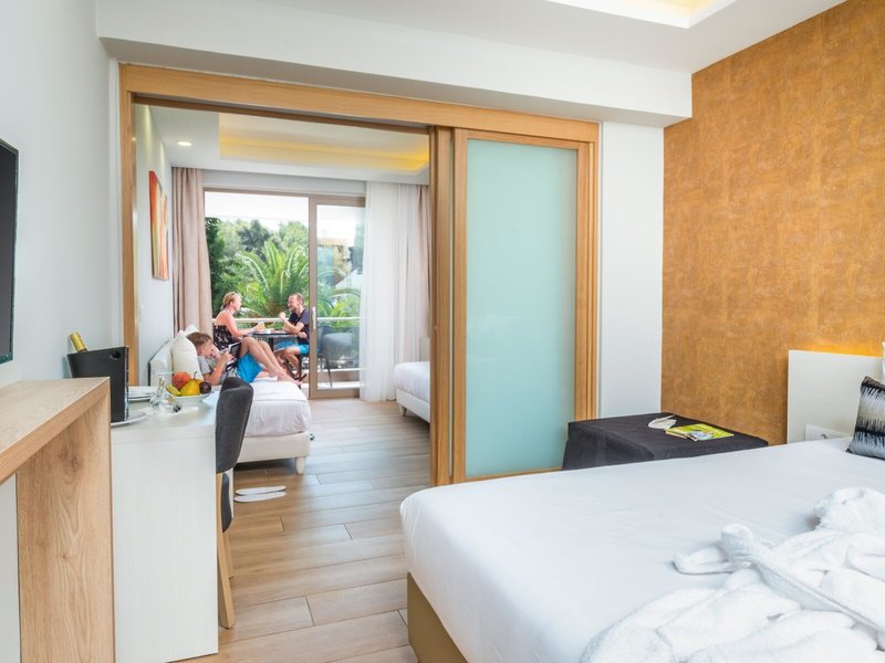 - Junior Suite (JSX1), Juniorsuite, Nichtraucherzimmer, Neubau, Gartenseite, Gartenblick, ca. 32 - 32 m², letzte Komplettrenovierung 2018, bestehend aus 2 Zimmern, optisch getrennt durch Schiebetür, 1 Queen Size Bett, 2 Schlafsofas, 1 Zustellbett, Babybett, Moskitonetz, Klimaanlage: individuell regelbar, kalt, warm, Heizung: individuell regelbar, Fußboden: Fliesenboden, Safe: ohne Gebühr, bei All Inclusive inklusive, Sofa, Schreibtisch, Bügeleisen, Kühlschrank: ohne Gebühr, bei All Inclusive inklusive, Telefon, Internet: WLAN/WiFi: ohne Gebühr, bei All Inclusive inklusive, Fernseher: Flatscreen, im Schlafzimmer, deutsches Programm, Sat-TV, Reinigungsservice: ohne Gebühr, bei All Inclusive inklusive, Badewanne oder Dusche, WC, Föhn, Kosmetikspiegel, Balkon: mit Sitzgelegenheit, Balkon oder Terrasse: mit Sitzgelegenheit