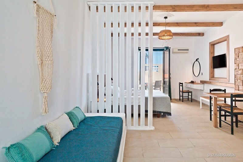 - Juniorsuite, renoviert, Bettwäsche, Handtücher und Matratzen aus 100% Bio-Baumwolle, kombinierter Wohn-/Schlafraum, Dusche, Haartrockner, Klimaanlage kostenpflichtig, Safe (kostenpflichtig), TV, WLAN, kostenpflichtig, Balkon