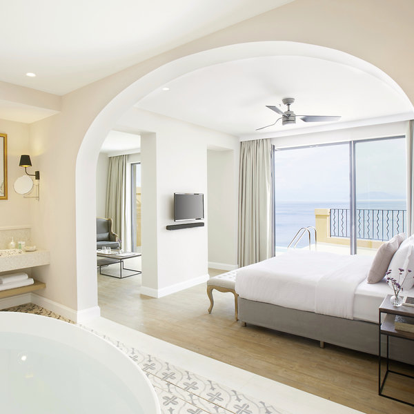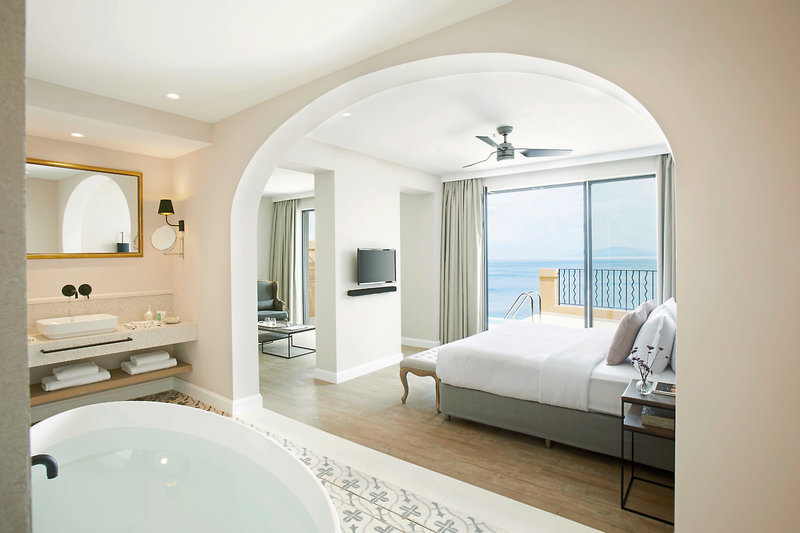 - 46-50 m2, suita, výhľad na more, kombinovaná obývačka/spálňa, vaňa, župan, papuče, sušič vlasov, klimatizácia, minibar, trezor, TV (satelitná TV), kávovar, káva/čaj, terasa (zariadená), priame vstup do bazéna, súkromný bazén
