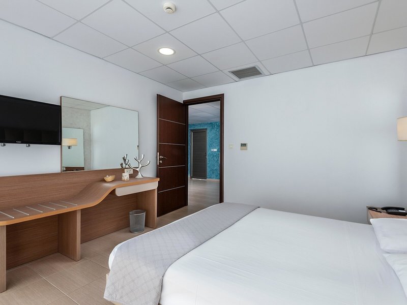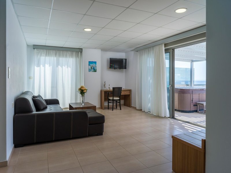 - Suita Junior s výhľadom na more (JSM1), suita Junior, v prístavbe, morská strana, výhľad na more, cca 25 - 35 m², celkový počet izieb v tomto type izby: 1, rozloženie: kombinovaná obývacia izba/spálňa, 2 jednolôžka (90x200cm), 1 rozkladacia pohovka (100x190cm), detská postieľka: zdarma, nutná požiadavka a rezervácia, klimatizácia: zadarmo, máj - október, individuálne nastaviteľná, studená, podlaha: dlažba, trezor: zdarma poplatok, pohovka, písací stôl, chladnička: zadarmo, kávovar/čajník, telefón, Internet: WLAN/WiFi: zadarmo, TV: plochá obrazovka, v spálni, satelitná TV, upratovanie: denne, zadarmo, sprcha, WC, fén, kozmetické zrkadlo, terasa: s posedením
