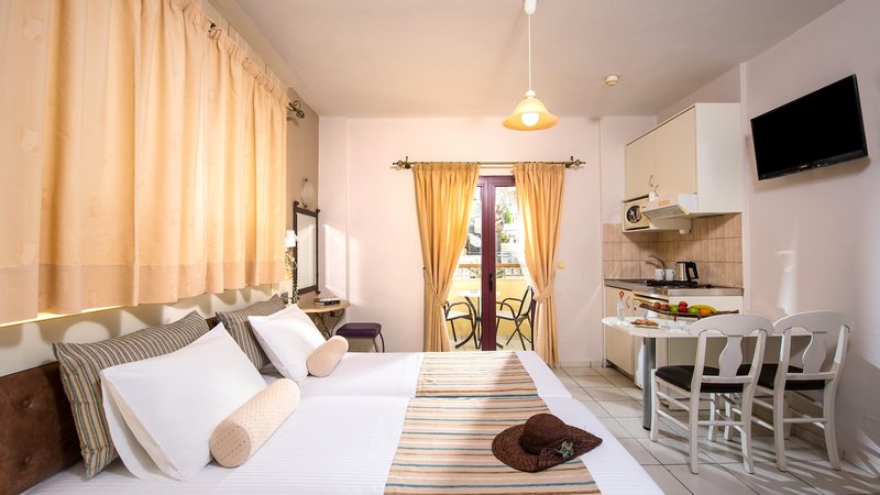 Die Zimmer sind ausgestattet mit King-Size-Bett oder Twinbett, 3 Extrabetten (Klappbett), Sofabett als Extrabett, gefliestem Boden, Kitchenette, Microwelle, Wasserkocher (ggf. geg. Gebühr), Balkon oder Terrasse, Internet (kostenlos), Safe (geg. Gebühr) und Flatscreen-TV mit lokalen Sendern sowie individuell regulierbarer Klimaanlage (von Mai bis Oktober, geg. Gebühr). Badezimmer mit Dusche (Größe: 22 m²). Handtücher werden 3x pro Woche kostenlos gewechselt. Die Bettwäsche wird 2x pro Woche kostenlos gewechselt.
