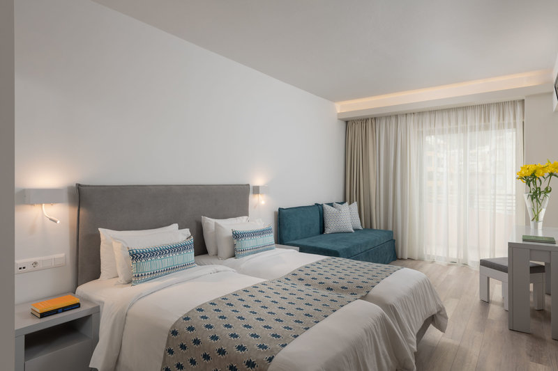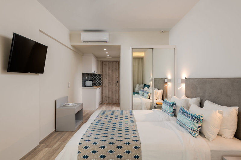 Die hellen, modern und komfortabel eingerichteten Zimmer mit Wohnraum sind ausgestattet mit Doppelbett, Twinbett oder Einzelbett, Babybett (kostenlos), Laminat, Kitchenette, Microwelle, Kapsel‑Kaffeemaschine (kostenlos), Wasserkocher (kostenlos), Balkon oder Terrasse, Internet (kostenlos), Safe (kostenlos) und Flatscreen-Sat-TV sowie individuell regulierbarer Klimaanlage und individuell regulierbarer Heizung (von April bis November). Badezimmer mit Dusche (Größe: 33 - 44 m²). Handtücher werden 3x pro Woche kostenlos gewechselt. Die Bettwäsche wird 3x pro Woche kostenlos gewechselt.