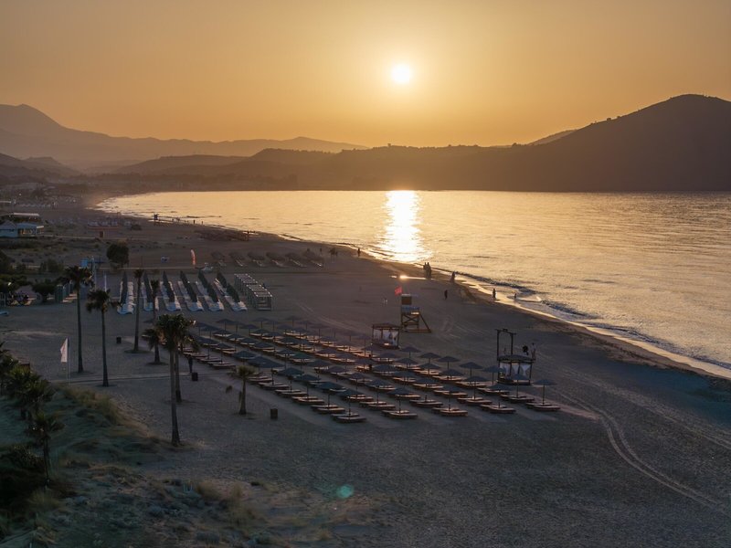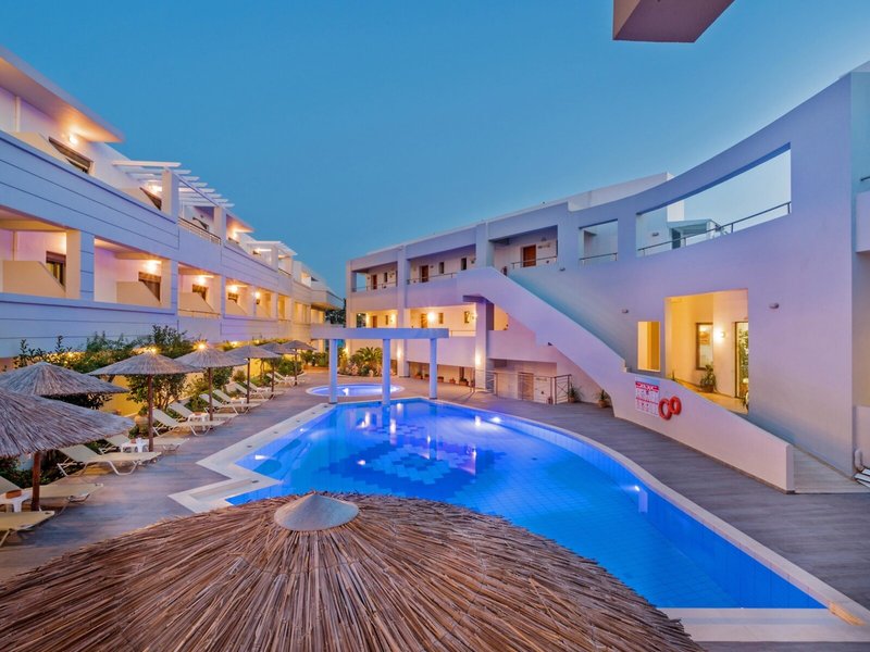 Poloha a okolie Hotel sa nachádza v malej dedinke Kavros. Od širokej, mierne sa zvažujúcej, približne 8 km dlhej piesočnatej pláže (cca 200 m) oddeľuje komplex len pobrežná cesta. Zábavu ponúka množstvo obchodov, reštaurácií, kaviarní a barov v bezprostrednej blízkosti. Obec Georgioupolis je vzdialená asi 3 km. Prestupové časy: Heraklion: cca 100 km, cca 2 hodiny / Chania: cca 50 km, cca 1 hod.