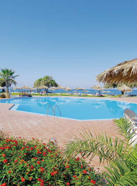 Blühende Gärten am blauen Meer. Hier liegt das Familienhotel direkt am schönen Sandstrand von Platanias, der mit der Blauen Flagge für Sauberkeit und Sicherheit ausgezeichnet wurde.