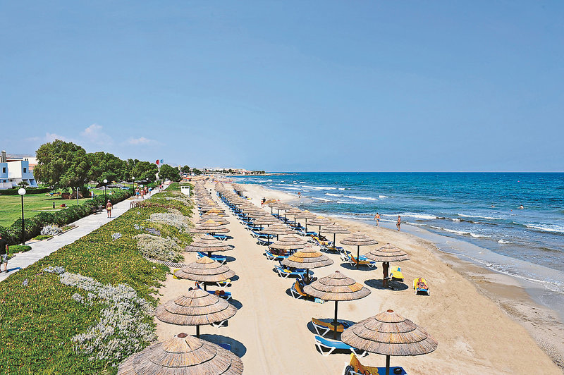- Sandstrand: leicht abfallend, ca. 350 m lang, von der Anlage getrennt durch Promenade, Sonnenschirme, Liegen, Strandtuch/Badetuch
