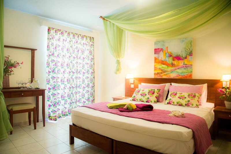 Für angenehmes Raumklima in den Zimmern sorgt eine Klimaanlage. Auf Balkon oder Terrasse lässt es sich für die Gäste herrlich entspannen. Die Zimmer verfügen über ein Queensize-Bett. Für Kinder stehen Kinderbetten kostenlos zur Verfügung. Wertsachen können in einem kostenpflichtig bereitgestellten Safe sicher aufbewahrt werden. Ein Kühlschrank zählt ebenfalls zur Standardeinrichtung. Ein Bügelset ist für den zusätzlichen Komfort der Gäste verfügbar. Darüber hinaus sind Sat-TV und WiFi (ohne Gebühr) vorhanden. Im Badezimmer – ausgestattet mit einer Dusche – gibt es einen Haartrockner. Für besonderen Komfort in den Badezimmern sorgt eine Auswahl an Handtüchern. Für Eltern mit Kindern stehen Familienzimmer zur Verfügung.
