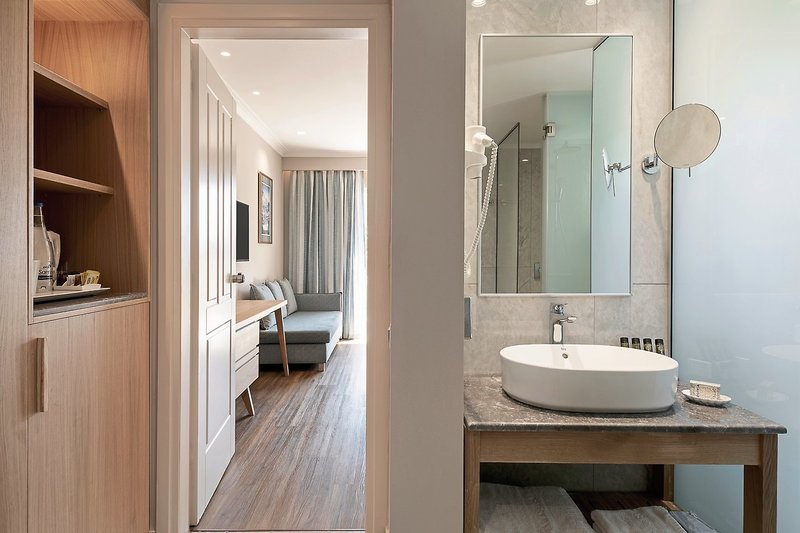 - 51-60 qm, Suite, Deluxe, Etage, 1., Poolblick, renoviert (2024), 2 separate Schlafzimmer, 1 separater Wohnraum, Couch, 2 Einzelbetten, Twinbett, Sofabett, 1 Bad, Badewanne, Whirlwanne, WC, Bademantel, Badeslipper, Haartrockner, Kosmetikspiegel, Klimaanlage, individuell regulierbar, Safe, 1 TV (Sat-TV), WLAN, Wasserkocher, Kaffee/Tee, Kühlschrank, Balkon (möbliert), bei Ankunft im Zimmer Obstkorb, Wein