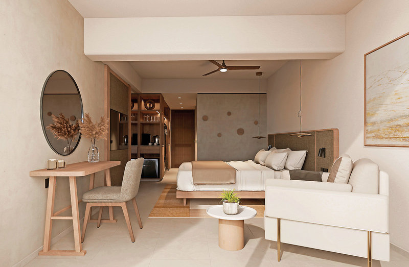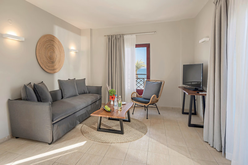 - 26-30 qm, Juniorsuite, Premium, Meerblick, kombinierter Wohn-/Schlafraum, 1 Bad, Dusche, WC, Bademantel, Badeslipper, Haartrockner, Klimaanlage, individuell regulierbar, Safe, 1 TV (Sat-TV), Kaffee/Tee, Kühlschrank, Terrasse (möbliert), direkter Poolzugang, Privatpool, bei Ankunft im Zimmer Obstkorb, Wein, Wasser