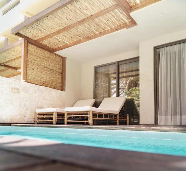 - Cozy Nest with Private Pool (DZX4), Doppelzimmer, Nichtraucherzimmer, Mindestalter im Zimmer: 16 Jahre, im Hauptgebäude, Gartenblick, ca. 35 - 38 m², letzte Komplettrenovierung 2023, Gesamtanzahl der Räume in diesem Zimmertyp: 2, Aufteilung wie folgt: kombiniertes Wohn-/Schlafzimmer, 1 King Size Bett, Klimaanlage: individuell regelbar, Fußboden: Fliesenboden, Safe, Sofa, Espressomaschine, Minibar: gegen Gebühr, Telefon, Internet: WLAN/WiFi, Fernseher: Flatscreen, Sat-TV, Kabel-TV, Reinigungsservice, Regendusche, Föhn, Kosmetikspiegel, Terrasse: mit Liegestühlen, mit Liegen, mit Sitzgelegenheit, mit Private Pool