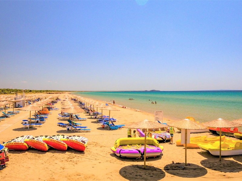 - PLÁŽ KALOGRIA: Piesková, jemný piesok, mierne sa zvažujúca, dĺžka pláže: cca 12 km, verejná s vlastnou hotelovou časťou, ležadlá: zdarma, v cene all inclusive, slnečníky: zdarma, v cene all inclusive