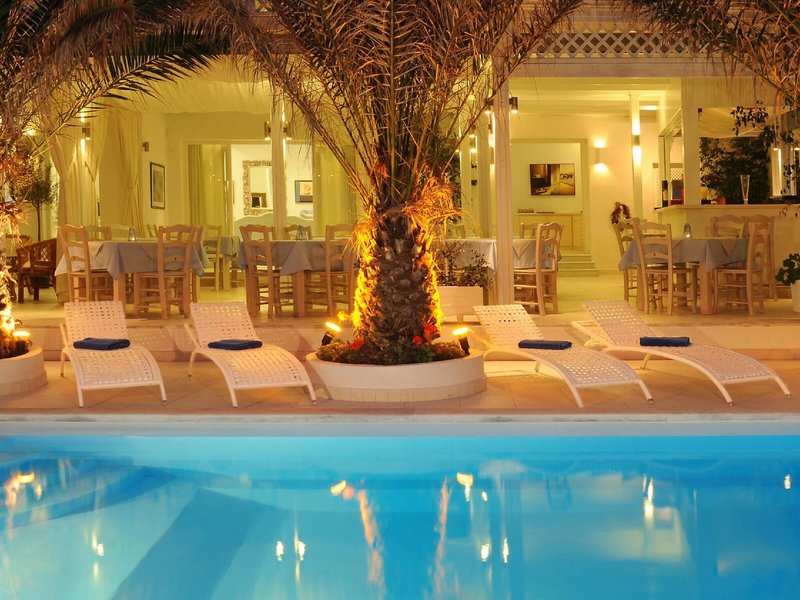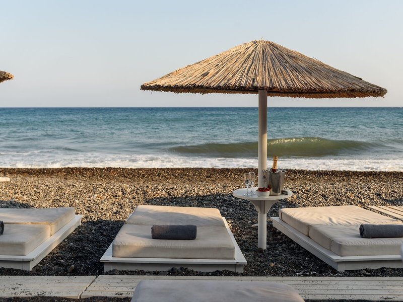 Lage & Umgebung Das Hotel liegt an dem schwarzen Strand von Kamari, nur rund 5 km vom Flughafen und Mesaria entfernt, zum Hafen sind es rund 12 km, Fira, die Hauptstadt von Santorin erreicht man nach ca. 7 km.