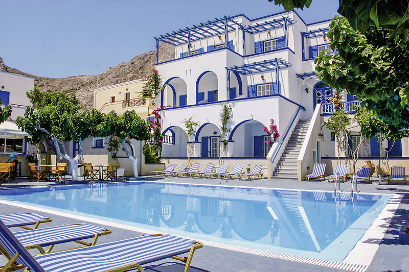 Die Farben Griechenlands – blau und weiß – prägen die gesamte Hotelanlage. Sogar die Liegestühle sind blau-weiß gestreift! Kamari bietet neben dem schönen Strand Unterhaltungsmöglichkeiten und Restaurants für jeden Geschmack