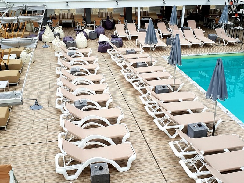 - Bazény: Vnútorný bazén, vonkajší bazén, slnečníky pri bazéne, ležadlá pri bazéne