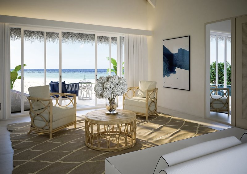 Die Zimmer: Die 85 Villen des Resorts bieten von der privaten, vollmöblierten Terrasse aus einen traumhaften Blick über den Indischen Ozean oder die tropische Vegetation. Jede Villa verfügt über ein offenes Bad mit separater Badewanne und Wasserfall-Dusche, Außendusche, Föhn, TV, WLAN, Kaffee-/Teezubereiter, Klimaanlage, Deckenventilator und einem „Oversized Daybed“ auf der Terrasse.