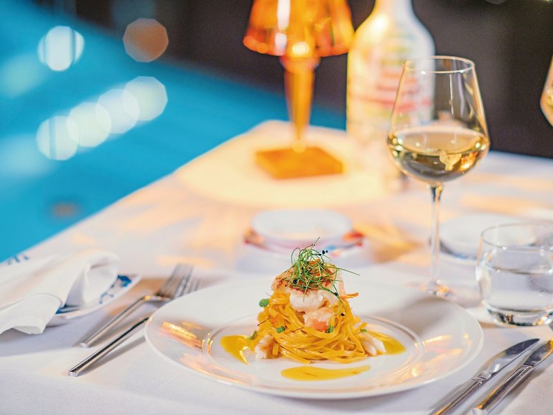 Kulinárske zážitky: V reštaurácii Taste si hostia môžu vychutnať bohaté raňajky na pláži. La Limonaia je talianska gurmánska reštaurácia rezortu, ktorá podáva sofistikované talianske jedlá sprevádzané živou hudbou vo večerných hodinách. Yama, japonská fusion reštaurácia, ponúka sushi, sashimi a teppanyaki. Hostia si môžu vychutnať aj stolovanie pod holým nebom v reštaurácii Fuego. Bar pri bazéne Mitro ponúka talianske jedlá a vynikajúci výber nápojov sprevádzaný atmosférickou hudbou. Pizza Boat poteší hostí autentickou talianskou pizzou.