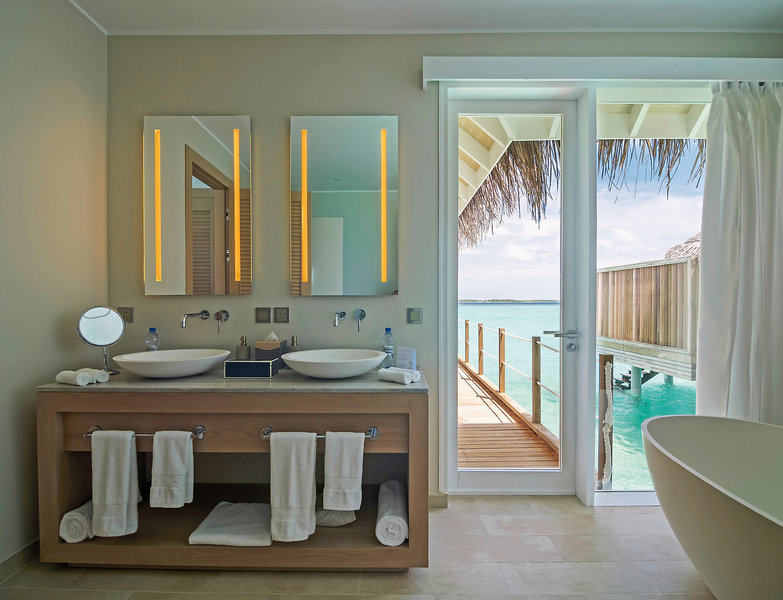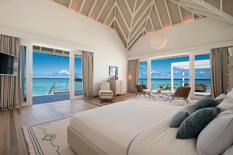 - >200 qm, Villa, Sonnenuntergangsseite, Wasserbungalow (auf Stelzen über der Lagune), Meerblick, 3 separate Schlafzimmer, separater Wohnraum, Sitzecke, 3 Bäder, Dusche, Badewanne, Außendusche, Haartrockner, Klimaanlage, Ventilator, TV, WLAN, Wasserkocher, Kaffee/Tee, Terrasse (möbliert), direkter Meerzugang, Butlerservice
