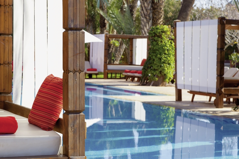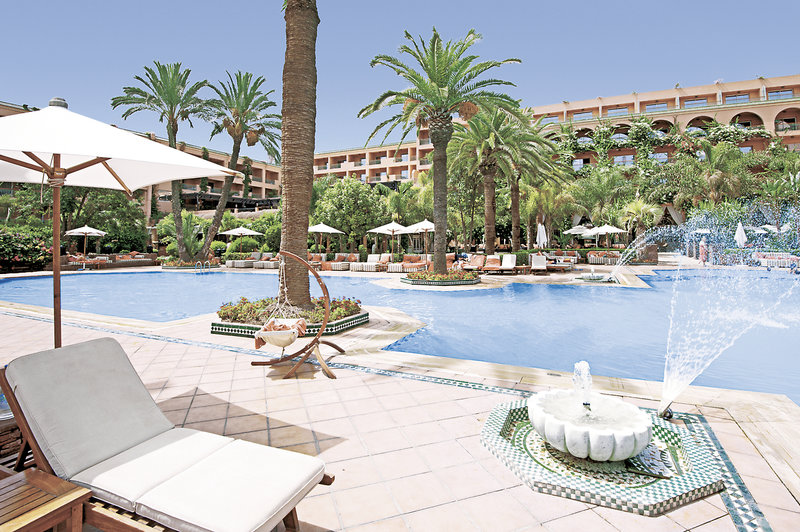 Der luxuriöse Hotelgarten mit Palmen, Grünflächen, Riads und mehreren Pools bietet eine perfekte Rückzugsoase – ideal zum Entspannen. Zwischen Poolliegen, Whirlpools und ruhigen Terrassen lässt sich der Trubel des Alltags vergessen.