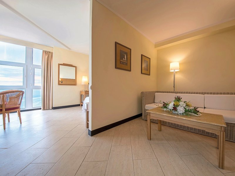 - 26-30 qm, Suite, Etage, oberen, Hauptgebäude, Meerblick (seitlich), kombinierter Wohn-/Schlafraum, Badewanne, Bademantel, Haartrockner, Klimaanlage, Mini-Kühlschrank, Safe, TV (Sat-TV), WLAN, Wasserkocher, Panoramafenster