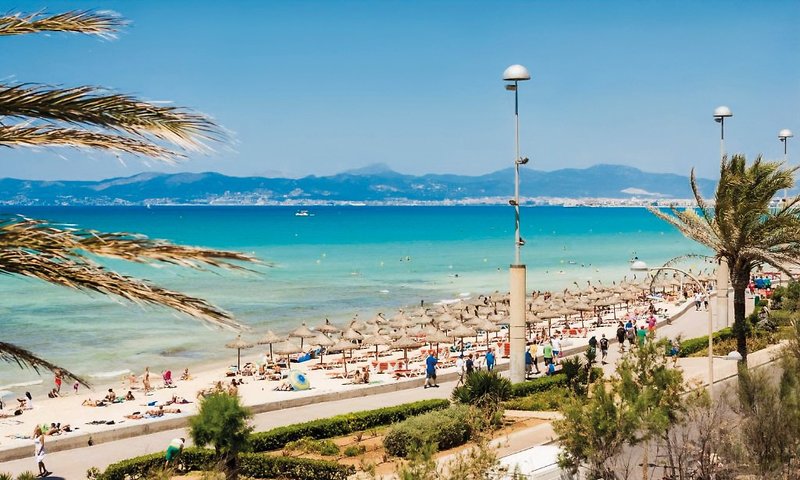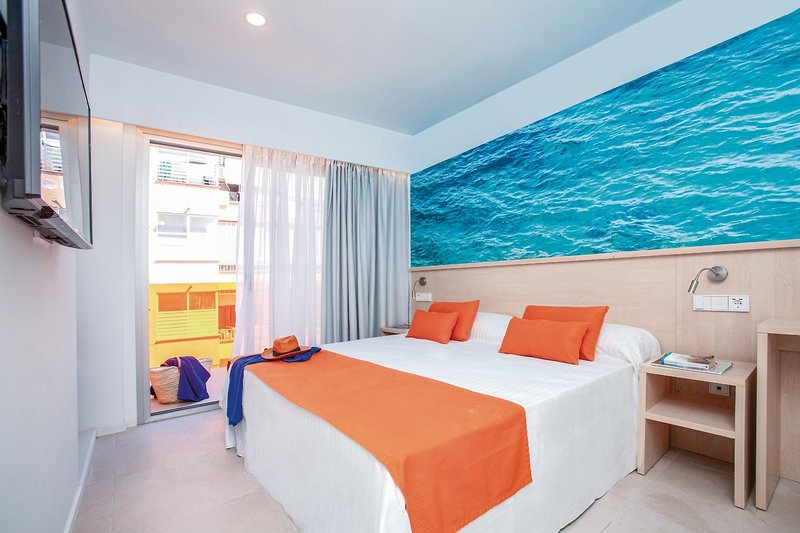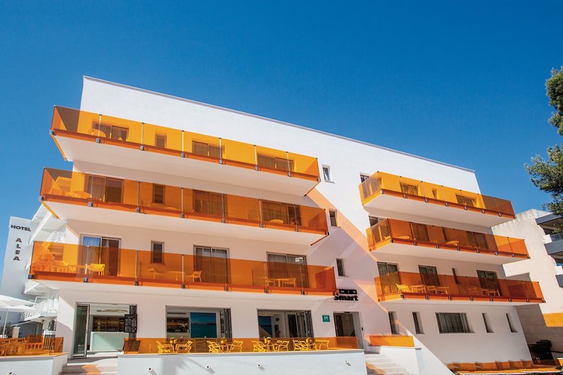 Ganz nahe dem Strand von El Arenal leuchtet dieses trendy Hotel mit seiner weißen Fassade und den stylischen Balkonen in durchscheinendem Orange. Die strahlen mit der Sonne um die Wette.