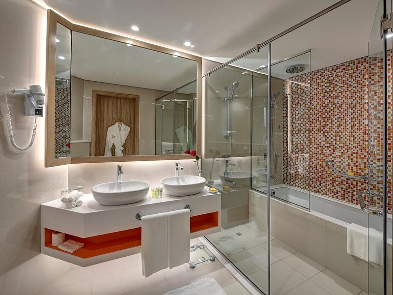 Vaše ubytovanie: Izby majú obývaciu izbu, kuchyňu a kúpeľňu s klimatizáciou pre príjemnú klímu. Izby s kobercami sú vybavené manželskou posteľou alebo posteľou veľkosti king. Prístelky sú k dispozícii na požiadanie. K dispozícii je aj trezor, minibar a písací stôl. K dispozícii je aj chladnička, minichladnička a príslušenstvo na prípravu čaju/kávy. Okrem toho je k dispozícii žehliaca súprava, lis na nohavice a sušička bielizne. Okrem toho je k dispozícii telefón, TV so satelitným/káblovým príjmom, napájací adaptér, budík a bezplatné Wi-Fi pripojenie. Papuče a denná tlač zabezpečujú ďalšie pohodlie. Kúpeľne sú vybavené sprchovacím kútom a vaňou. Pre vaše pohodlie je k dispozícii sušič vlasov, kozmetické zrkadlo, župany a telefón. Ako špeciálny doplnok hostia ocenia bezplatné toaletné potreby a výber uterákov v kúpeľniach. K dispozícii sú aj bezbariérové izby s bezbariérovou kúpeľňou. Hotel ponúka rodinné izby a nefajčiarske izby.