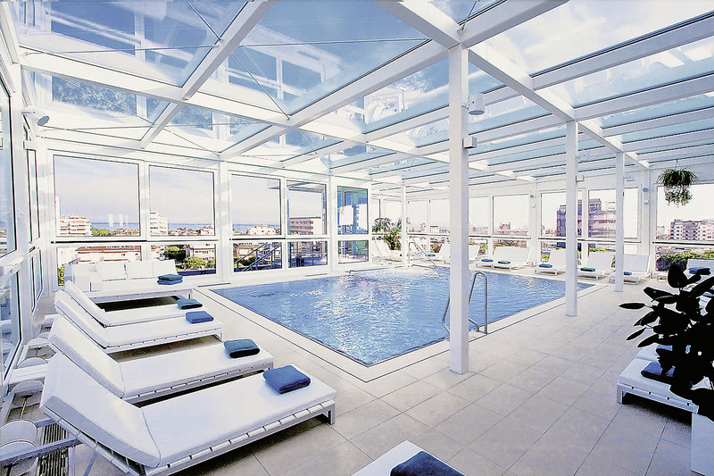 Alles, was man sich wünscht: Großartig ist der Blick von der Sonnenterrasse mit Ruhebetten über Häuser und Meer, lichtdurchflutet der Indoor-Pool im obersten Stock mit Fernblick. Echt top!