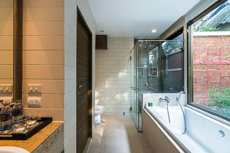 - 51-60 qm, Villa, Nebengebäude, Gartenblick (direkt), Nichtraucher, Schreibtisch, Doppelbetten (1 Doppel- oder 2 Einzelbetten), Dusche oder Badewanne, WC, Haartrockner, Klimaanlage, Minibar kostenpflichtig, Safe, TV (Smart-TV), WLAN, Wasserkocher, Kaffee/Tee, Balkon oder Terrasse (möbliert), Anzahl Zimmer: 6