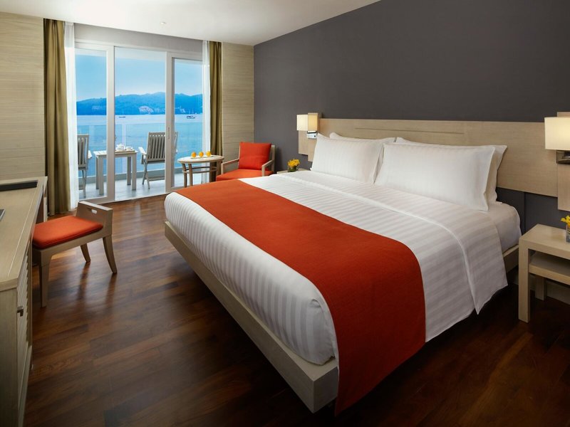 - Superior Ocean Front Balcony (DZM2), im Hauptgebäude, Meerseite, Meerblick, Buchtblick, ca. 33 m², letzte Komplettrenovierung 2023, Gesamtanzahl der Räume in diesem Zimmertyp: 1, Aufteilung wie folgt: 1 Schlafzimmer, 1 Einzelbett (182x198cm), Babybett, Klimaanlage: ohne Gebühr, individuell regelbar, kalt, Fußboden: Parkett, Safe: ohne Gebühr, Standventilator, Getränkespender, Sofa, Schreibtisch, Bügeleisen, Bügelbrett, Wasserkocher, Minibar: Softdrinks, Wasser, alkoholische Getränke, Snacks, Minibarauffüllung, Telefon, Internet: WLAN/WiFi, Fernseher: Flatscreen, deutsches Programm, Deutsche Welle, Sat-TV, Kabel-TV, DVD-Player, Radio, Roomservice, Reinigungsservice, Dusche, WC, Bademantel, Slipper, Föhn, Balkon: mit Sitzgelegenheit, Balkon oder Terrasse: mit Liegestühlen, Terrasse