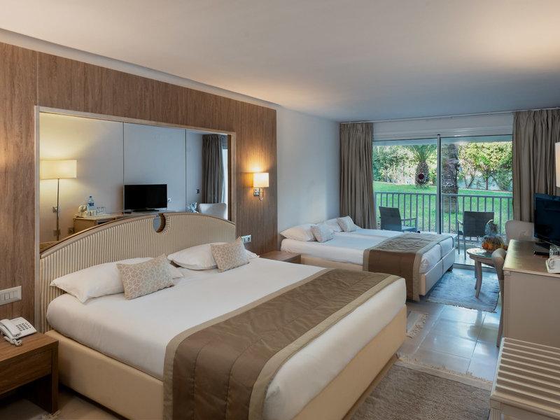 - Family Room Garden View (FZX1), Familienzimmer, Nichtraucherzimmer, im Hauptgebäude, Neubau, Gartenblick, ca. 32 - 32 m², letzte Komplettrenovierung 2017, Gesamtanzahl der Räume in diesem Zimmertyp: 1, Aufteilung wie folgt: kombiniertes Wohn-/Schlafzimmer, 2 Einzelbetten, 1 Doppelbett, Klimaanlage: Juni - September, zentral gesteuert, Heizung: zentral gesteuert, Fußboden: Fliesenboden, Safe, Deckenventilator, Minibar: Wasser, Telefon, Internet: WLAN/WiFi, Fernseher: Flatscreen, im Schlafzimmer, deutsches Programm, Deutsche Welle, Sat-TV, Kabel-TV, Reinigungsservice, Badewanne oder Dusche, WC, Föhn, Balkon oder Terrasse, Terrasse