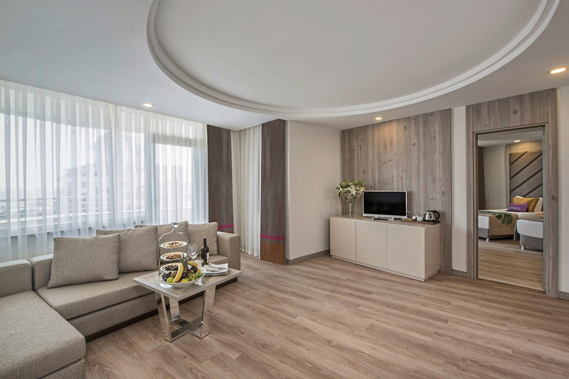 - 51-60 qm, Familien, mit Verbindungstür, Hauptgebäude, Meerblick (seitlich), 2 separate Schlafzimmer, 1 Bad, Dusche, 1 WC, Haartrockner, Laminatboden, Klimaanlage, zentral gesteuert, Minibar, Auffüllung regelmäßig, Safe, 1 TV (Sat-TV, deutschsprachiges Programm, landestypisches Programm, Flachbildschirm), Balkon (möbliert)