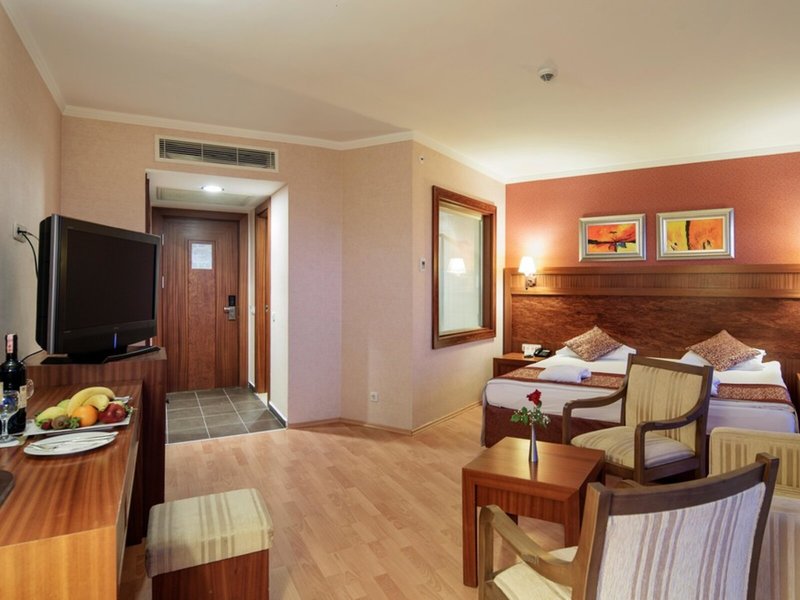 - Suite Room Land View (STX1), Suite, Nichtraucherzimmer, Mindestalter im Zimmer: 16 Jahre, im Hauptgebäude, Landseite, ca. 41 m², Gesamtanzahl der Räume in diesem Zimmertyp: 2, Aufteilung wie folgt: bestehend aus 2 Doppelzimmern mit Verbindungstür, 2 Einzelbetten, 1 Doppelbett, Klimaanlage: ohne Gebühr, saisonabhängig, zentral gesteuert, kalt, warm, Fußboden: Laminat, Safe: ohne Gebühr, Kaffee-/Teezubereiter, Wasserkocher, Minibar: ohne Gebühr, Softdrinks: ohne Gebühr, Wasser: ohne Gebühr, Snacks: ohne Gebühr, Minibarauffüllung: täglich 09:00 Uhr - 16:00 Uhr, Internet: WLAN/WiFi: gegen Gebühr, Fernseher: Flatscreen, deutsches Programm, Sat-TV, Roomservice: 24 Stunden, gegen Gebühr, Reinigungsservice: täglich 09:00 Uhr - 16:00 Uhr und 24 Stunden, ohne Gebühr, Badewanne, WC, Bademantel: ohne Gebühr, Slipper: ohne Gebühr, Föhn, Kosmetikspiegel, Balkon: mit Sitzgelegenheit