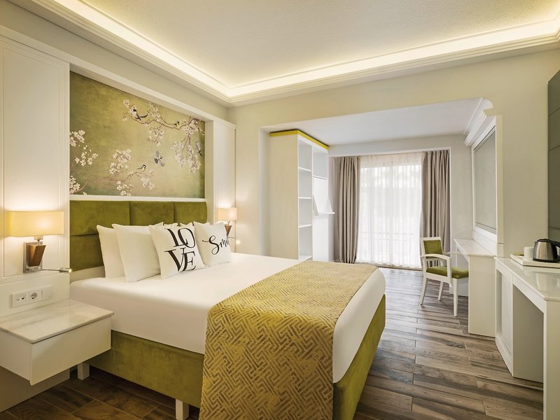 - 26-30 m², rodinná izba, s prepojovacími dverami, umiestnenie pri bazéne, výhľad na bazén, posteľná bielizeň, uteráky a matrace vyrobené zo 100% organickej bavlny, 2 samostatné spálne, 1 francúzska posteľ, 2 rozkladacie postele, 1 kúpeľňa, sprchovací kút, 1 WC, župan, papuče, sušič vlasov, laminátová podlaha, individuálne ovládaná klimatizácia, minibar (pravidelne dopĺňaný), nealkoholické nápoje, minerálna voda, pivo, trezor, 1 TV (satelitná TV), rýchlovarná kanvica, terasa (zariadená), priamy prístup k bazénu, samostatná plážová časť, večera v špecializovanej reštaurácii