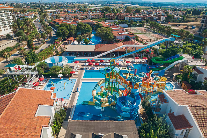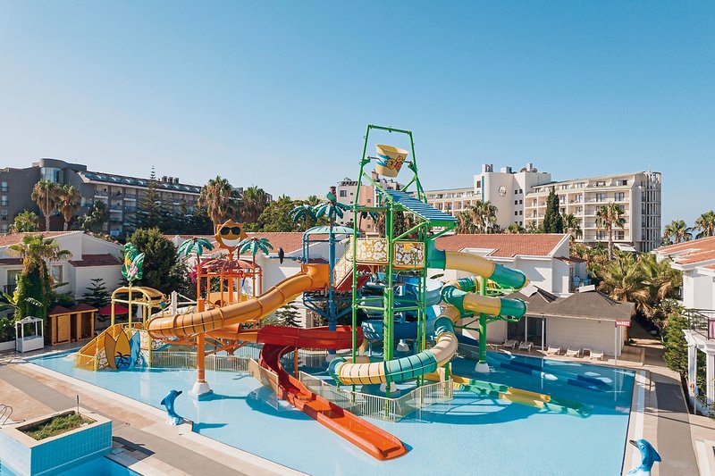 - 1 Pool: 250 qm, Wasserrutschen: 10 (stundenweise in Betrieb), Sonnenschirme, Liegen, Badetuch