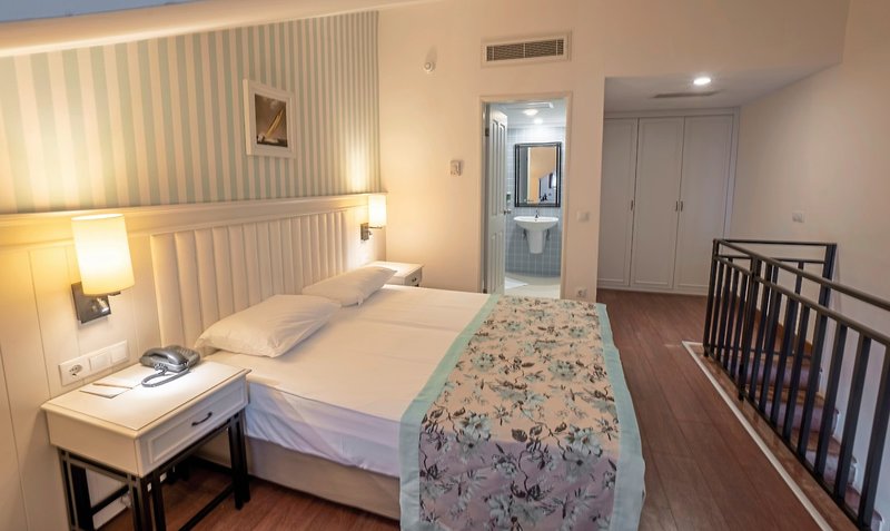 - 36-40 m², mezonet, 2 poschodia, hlavná budova, nefajčiarsky, samostatná spálňa, obývacia izba/spálňa, posedenie, manželská posteľ, rozkladacia pohovka, 2 kúpeľne, sprchovací kút, 2 toalety, sušič vlasov, centrálne ovládaná klimatizácia, cca 1. júna - 31. augusta, minibar (dopĺňa sa pri príchode), nealkoholické nápoje, voda, trezor (za poplatok), 2 televízory (satelitná TV, plochá obrazovka), káva/čaj, balkón