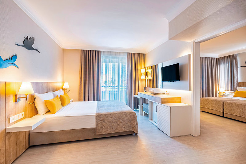 - 31-35 m2, rodiny, hlavná budova, výhľad na more, 2 samostatné spálne, 1 kúpeľňa, sprcha, WC, klimatizácia, centrálne ovládané, minibar, denne dopĺňané, nealko nápoje, minerálna voda, voda, trezor, 1 TV (satelitná TV , smart TV ), rýchlovarná kanvica, káva/čaj, balkón