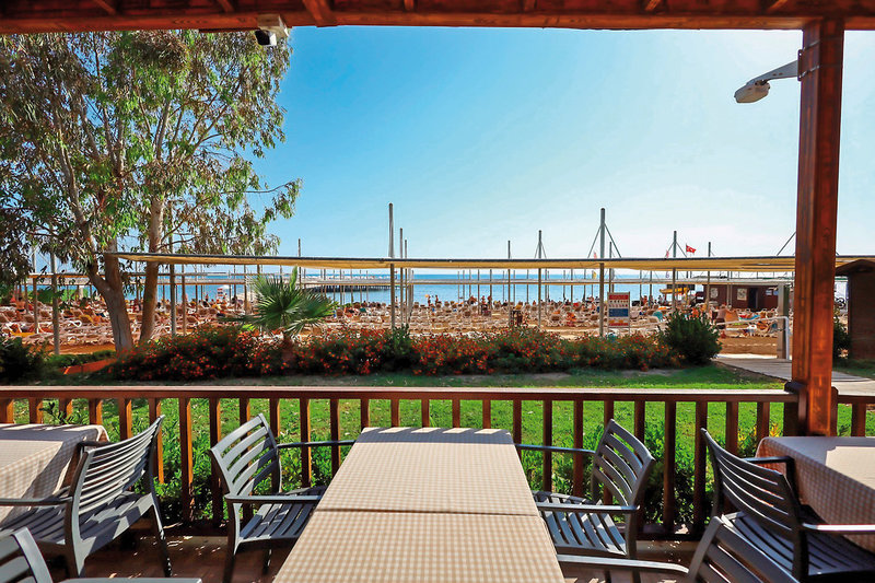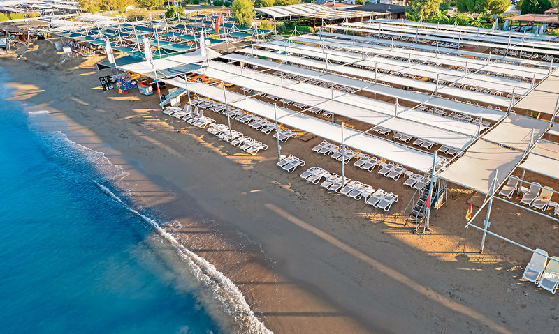 - Sandstrand: flach abfallend, gehört zur Anlage, von der Anlage getrennt durch Straße, Sonnenschirme, Liegen, Strandtuch/Badetuch, Strandservice (ca. 1.4.-31.10.)