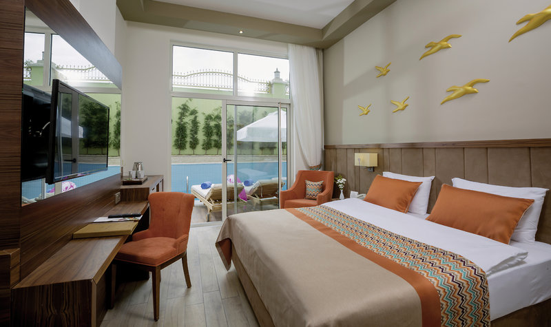 - 26-30 m², dvojlôžková izba, pre dospelých od 16 rokov, pri bazéne, posteľná bielizeň, uteráky a matrace vyrobené zo 100 % organickej bavlny, 1 kúpeľňa, sprchovací kút, župan, papuče, laminátová podlaha, centrálne ovládaná klimatizácia, minibar (dopĺňaný denne), trezor, 1 TV (satelitná TV), rýchlovarná kanvica, príslušenstvo na prípravu kávy/čaju, zariadená terasa, priamy prístup k bazénu, popoludňajšia káva/čaj a pečivo, ovocný košík a víno pri príchode